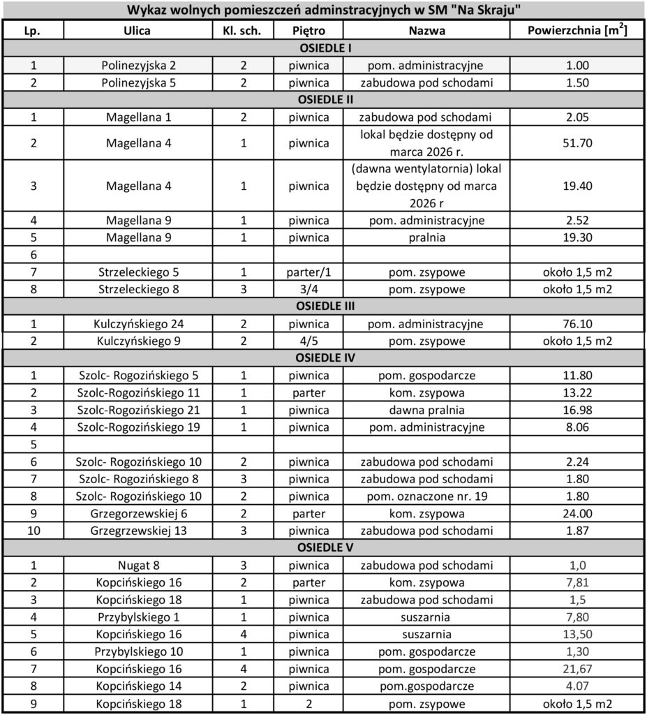 Spółdzielnia Mieszkaniowa „Na Skraju” informuje o pomieszczeniach administracyjnych do wynajęcia: